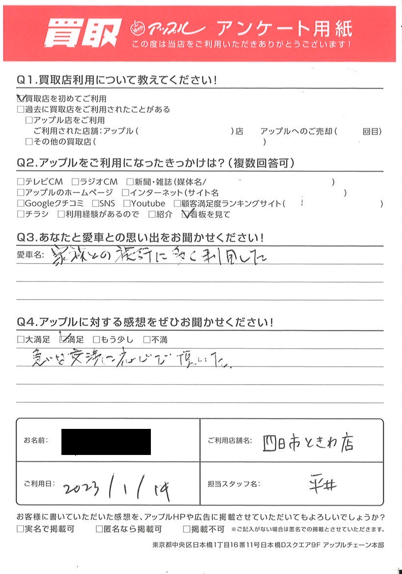 お車のご相談・ 査定だけでもOK! カンタン 入力 30秒 アップルがブランド買取始めました! お電話でも受付中! 受付時間10:00 ~ 18:30 0120-174-177 お車のご相談・ 査定だけでもOK! カンタン 入力 30秒 アップルがブランド買取始めました! お電話でも受付中! 受付時間10:00 ~ 18:30 0120-174-177 アップルがブランド買取始めました! お電話でも受付中! 受付時間10:00 ~ 18:30 0120-174-177 店舗情報 在庫車 スタッフ紹介 ブログ お客様の声 キャンペーン お得 無料査定 click お客様の声 ご記入日: 2023/01/14 I様 車名:ホンダ フリードスパイク 急な交渉に応じて頂いた。 前へ 次へ お客様の声一覧を見る