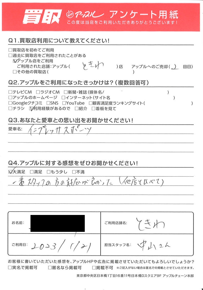 お車のご相談・ 査定だけでもOK! カンタン 入力 30秒 アップルがブランド買取始めました! お電話でも受付中! 受付時間10:00 ~ 18:30 0120-174-177 お車のご相談・ 査定だけでもOK! カンタン 入力 30秒 アップルがブランド買取始めました! お電話でも受付中! 受付時間10:00 ~ 18:30 0120-174-177 アップルがブランド買取始めました! お電話でも受付中! 受付時間10:00 ~ 18:30 0120-174-177 店舗情報 在庫車 スタッフ紹介 ブログ お客様の声 キャンペーン お得 無料査定 click お客様の声 ご記入日: 2023/01/21 T様 車名:スバル インプレッサスポーツ 一番スタッフの方の対応が良かった(他店と比べて) 前へ 次へ お客様の声一覧を見る