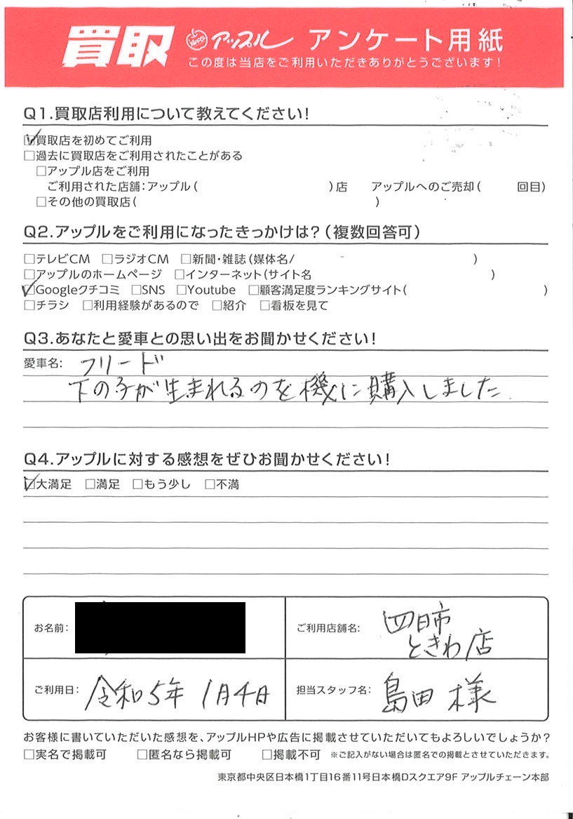 お車のご相談・ 査定だけでもOK! カンタン 入力 30秒 アップルがブランド買取始めました! お電話でも受付中! 受付時間10:00 ~ 18:30 0120-174-177 お車のご相談・ 査定だけでもOK! カンタン 入力 30秒 アップルがブランド買取始めました! お電話でも受付中! 受付時間10:00 ~ 18:30 0120-174-177 アップルがブランド買取始めました! お電話でも受付中! 受付時間10:00 ~ 18:30 0120-174-177 店舗情報 在庫車 スタッフ紹介 ブログ お客様の声 キャンペーン お得 無料査定 click お客様の声 ご記入日: 2023/01/04 H様 車名:ホンダ フリードハイブリッド(~H28年8月) 下の子が生まれるのを機に購入しました 前へ 次へ お客様の声一覧を見る