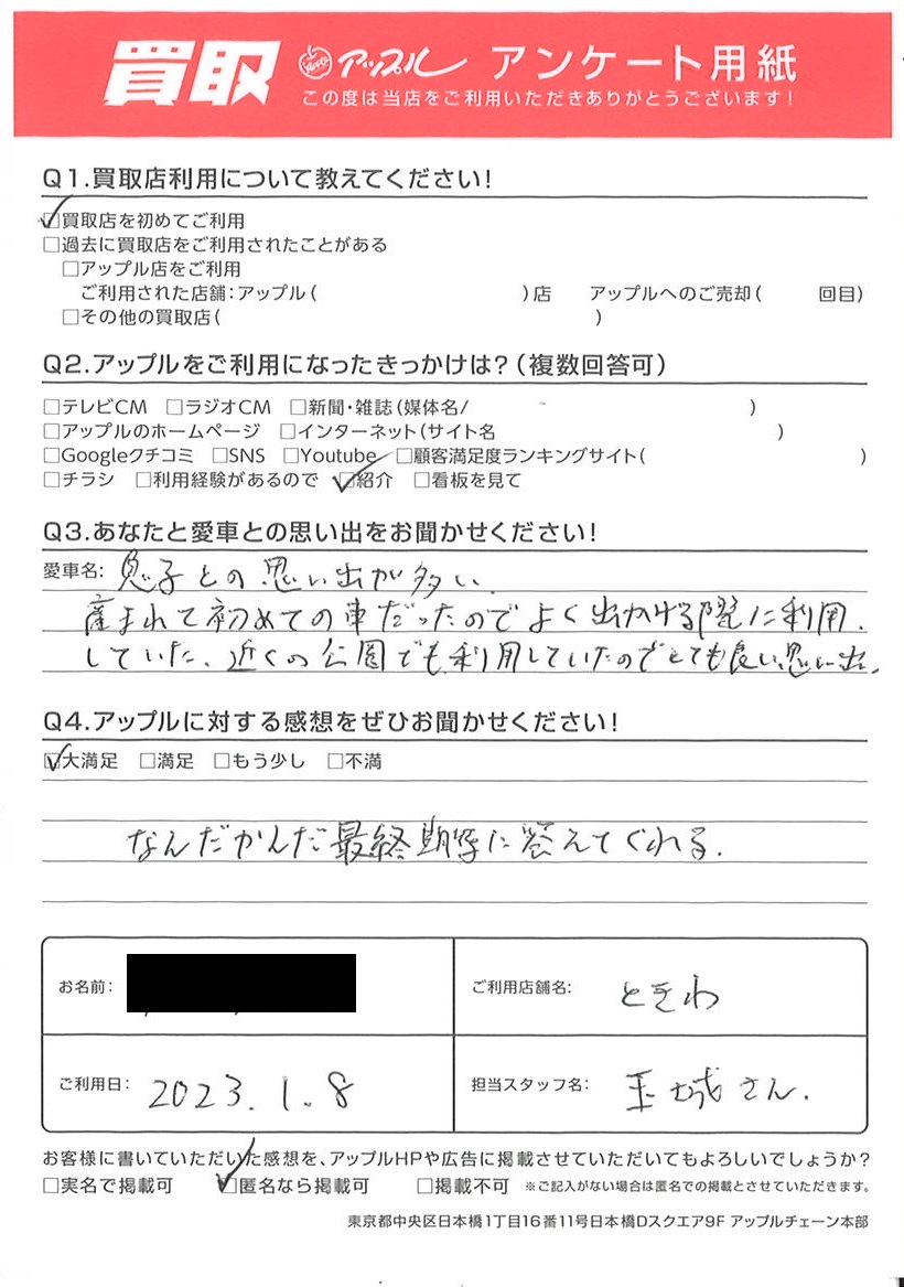 お車のご相談・ 査定だけでもOK! カンタン 入力 30秒 アップルがブランド買取始めました! お電話でも受付中! 受付時間10:00 ~ 18:30 0120-174-177 お車のご相談・ 査定だけでもOK! カンタン 入力 30秒 アップルがブランド買取始めました! お電話でも受付中! 受付時間10:00 ~ 18:30 0120-174-177 アップルがブランド買取始めました! お電話でも受付中! 受付時間10:00 ~ 18:30 0120-174-177 店舗情報 在庫車 スタッフ紹介 ブログ お客様の声 キャンペーン お得 無料査定 click お客様の声 ご記入日: 2023/01/08 O様 車名:ダイハツ タント なんだかんだ最終期待に答えてくれる。 前へ 次へ お客様の声一覧を見る