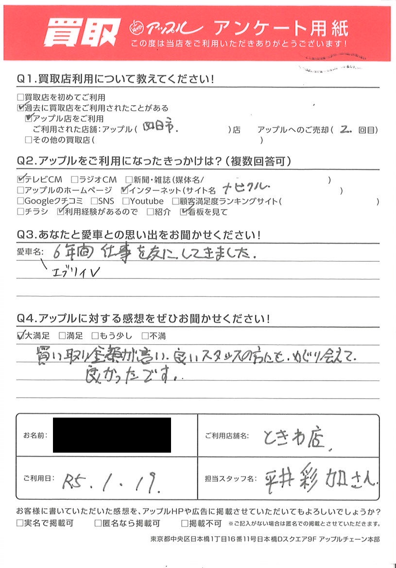 お車のご相談・ 査定だけでもOK! カンタン 入力 30秒 アップルがブランド買取始めました! お電話でも受付中! 受付時間10:00 ~ 18:30 0120-174-177 お車のご相談・ 査定だけでもOK! カンタン 入力 30秒 アップルがブランド買取始めました! お電話でも受付中! 受付時間10:00 ~ 18:30 0120-174-177 アップルがブランド買取始めました! お電話でも受付中! 受付時間10:00 ~ 18:30 0120-174-177 店舗情報 在庫車 スタッフ紹介 ブログ お客様の声 キャンペーン お得 無料査定 click お客様の声 ご記入日: 2023/01/19 N様 車名:スズキ エブリイ 買い取り金額が高い、良いスタッフの方にも、めぐり会えて良かったです。 前へ 次へ お客様の声一覧を見る