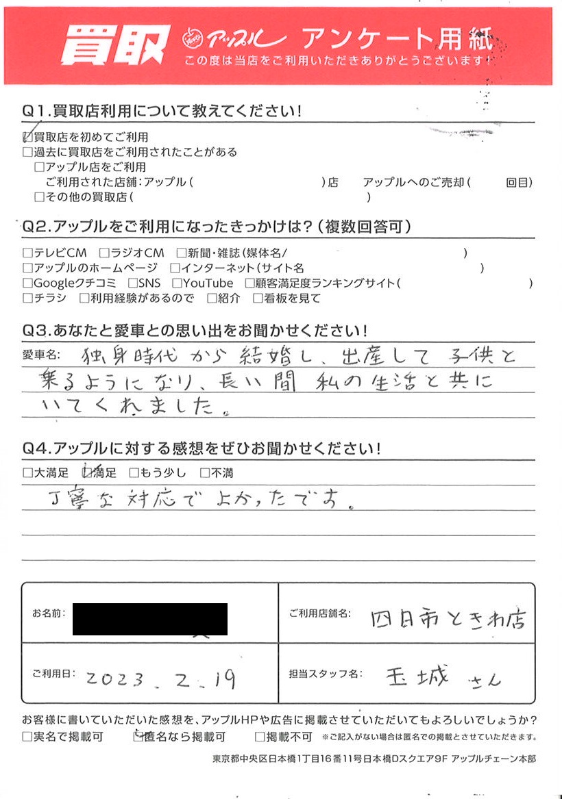 お車のご相談・ 査定だけでもOK! カンタン 入力 30秒 アップルがブランド買取始めました! お電話でも受付中! 受付時間10:00 ~ 18:30 0120-174-177 お車のご相談・ 査定だけでもOK! カンタン 入力 30秒 アップルがブランド買取始めました! お電話でも受付中! 受付時間10:00 ~ 18:30 0120-174-177 アップルがブランド買取始めました! お電話でも受付中! 受付時間10:00 ~ 18:30 0120-174-177 店舗情報 在庫車 スタッフ紹介 ブログ お客様の声 キャンペーン お得 無料査定 click お客様の声 ご記入日: 2023/02/19 I様 車名:日産 マーチ 丁寧な対応でよかったです。 前へ 次へ お客様の声一覧を見る