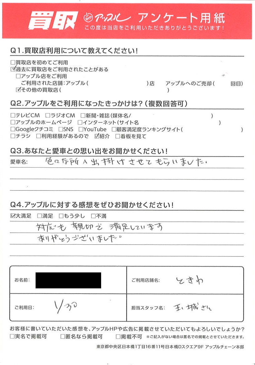 お車のご相談・ 査定だけでもOK! カンタン 入力 30秒 アップルがブランド買取始めました! お電話でも受付中! 受付時間10:00 ~ 18:30 0120-174-177 お車のご相談・ 査定だけでもOK! カンタン 入力 30秒 アップルがブランド買取始めました! お電話でも受付中! 受付時間10:00 ~ 18:30 0120-174-177 アップルがブランド買取始めました! お電話でも受付中! 受付時間10:00 ~ 18:30 0120-174-177 店舗情報 在庫車 スタッフ紹介 ブログ お客様の声 キャンペーン お得 無料査定 click お客様の声 ご記入日: 2023/01/30 S様 車名:ダイハツ ミラココア 対応も親切で満足していますありがとうございました。 前へ 次へ お客様の声一覧を見る