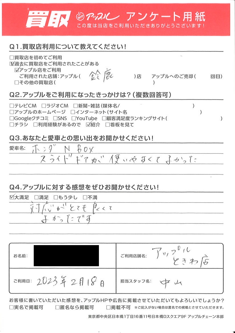 お車のご相談・ 査定だけでもOK! カンタン 入力 30秒 アップルがブランド買取始めました! お電話でも受付中! 受付時間10:00 ~ 18:30 0120-174-177 お車のご相談・ 査定だけでもOK! カンタン 入力 30秒 アップルがブランド買取始めました! お電話でも受付中! 受付時間10:00 ~ 18:30 0120-174-177 アップルがブランド買取始めました! お電話でも受付中! 受付時間10:00 ~ 18:30 0120-174-177 店舗情報 在庫車 スタッフ紹介 ブログ お客様の声 キャンペーン お得 無料査定 click お客様の声 ご記入日: 2023/02/18 O様 車名:ホンダ N-BOX 対応がとても良くてよかったです 前へ 次へ お客様の声一覧を見る
