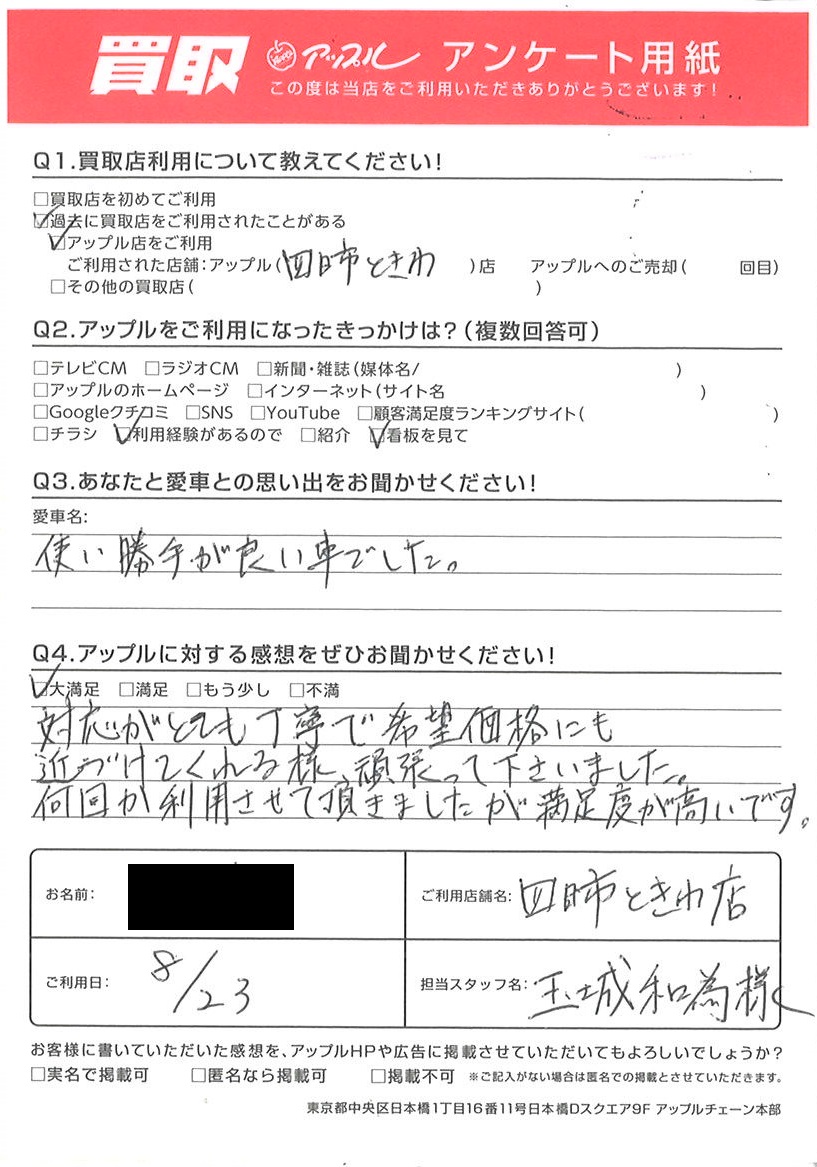 お車のご相談・ 査定だけでもOK! カンタン 入力 30秒 アップルがブランド買取始めました! お電話でも受付中! 受付時間10:00 ~ 18:30 0120-174-177 お車のご相談・ 査定だけでもOK! カンタン 入力 30秒 アップルがブランド買取始めました! お電話でも受付中! 受付時間10:00 ~ 18:30 0120-174-177 アップルがブランド買取始めました! お電話でも受付中! 受付時間10:00 ~ 18:30 0120-174-177 店舗情報 在庫車 スタッフ紹介 ブログ お客様の声 キャンペーン お得 無料査定 click お客様の声 ご記入日: 2023/08/23 S様 車名:ダイハツ ハイゼットトラック(H11年1月~) 対応がとても丁寧で希望価格にも近づけてくれる様、頑張って下さいました。何回か利用させて頂きましたが満足度が高いです。 前へ 次へ お客様の声一覧を見る
