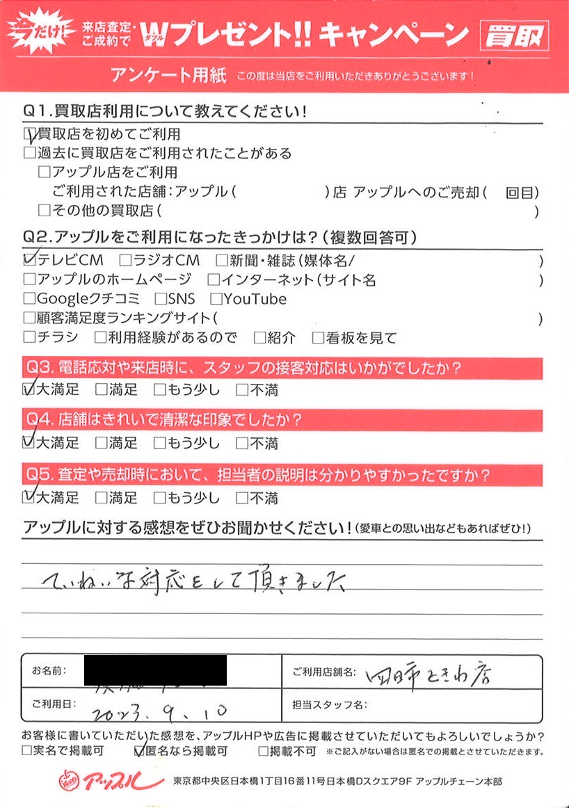 お車のご相談・ 査定だけでもOK! カンタン 入力 30秒 アップルがブランド買取始めました! お電話でも受付中! 受付時間10:00 ~ 18:30 0120-174-177 お車のご相談・ 査定だけでもOK! カンタン 入力 30秒 アップルがブランド買取始めました! お電話でも受付中! 受付時間10:00 ~ 18:30 0120-174-177 アップルがブランド買取始めました! お電話でも受付中! 受付時間10:00 ~ 18:30 0120-174-177 店舗情報 在庫車 スタッフ紹介 ブログ お客様の声 キャンペーン お得 無料査定 click お客様の声 ご記入日: 2023/09/10 S様 車名:トヨタ ハリアー (H25年12月~のハイブリッド含む) ていねいな対応をして頂きました 前へ 次へ お客様の声一覧を見る