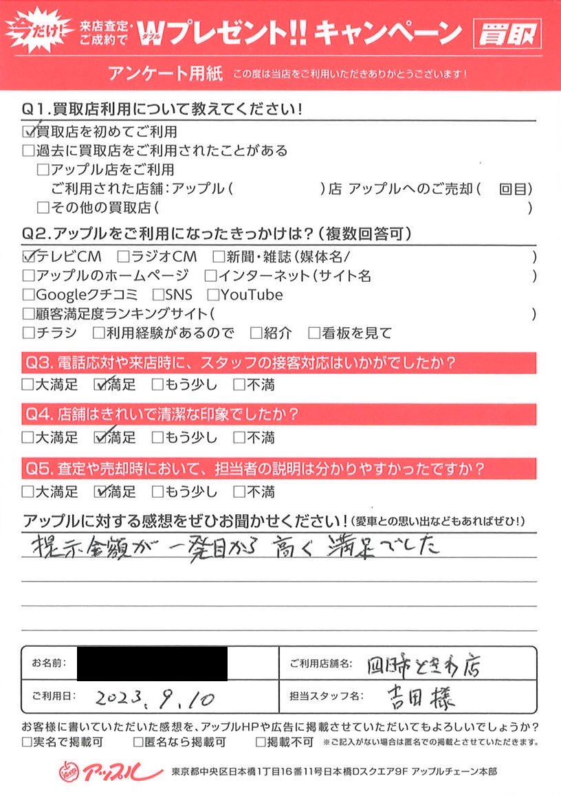 お車のご相談・ 査定だけでもOK! カンタン 入力 30秒 アップルがブランド買取始めました! お電話でも受付中! 受付時間10:00 ~ 18:30 0120-174-177 お車のご相談・ 査定だけでもOK! カンタン 入力 30秒 アップルがブランド買取始めました! お電話でも受付中! 受付時間10:00 ~ 18:30 0120-174-177 アップルがブランド買取始めました! お電話でも受付中! 受付時間10:00 ~ 18:30 0120-174-177 店舗情報 在庫車 スタッフ紹介 ブログ お客様の声 キャンペーン お得 無料査定 click お客様の声 ご記入日: 2023/09/10 N様 車名:三菱 デリカD:5 提示金額が一発目から高く満足でした 前へ 次へ お客様の声一覧を見る