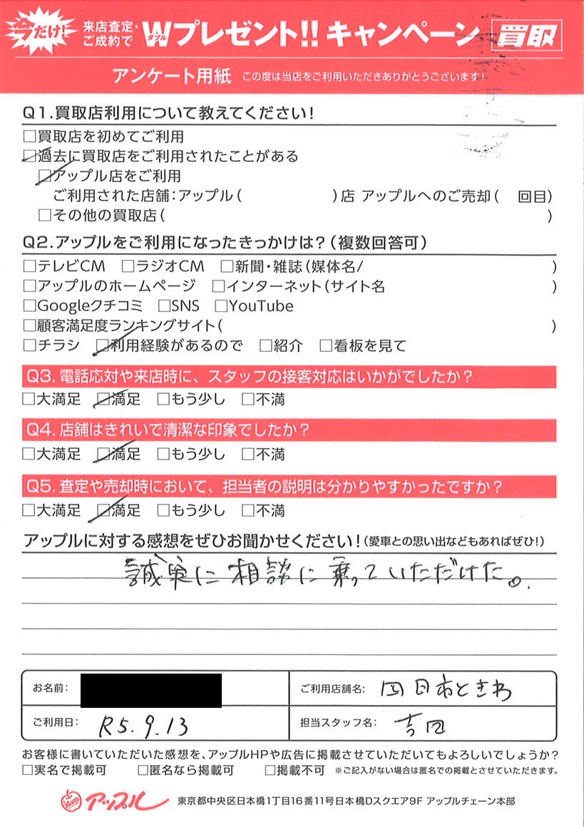 お車のご相談・ 査定だけでもOK! カンタン 入力 30秒 アップルがブランド買取始めました! お電話でも受付中! 受付時間10:00 ~ 18:30 0120-174-177 お車のご相談・ 査定だけでもOK! カンタン 入力 30秒 アップルがブランド買取始めました! お電話でも受付中! 受付時間10:00 ~ 18:30 0120-174-177 アップルがブランド買取始めました! お電話でも受付中! 受付時間10:00 ~ 18:30 0120-174-177 店舗情報 在庫車 スタッフ紹介 ブログ お客様の声 キャンペーン お得 無料査定 click お客様の声 ご記入日: 2023/09/13 I様 車名:ダイハツ タント 誠実に相談に乗っていただけた。 前へ 次へ お客様の声一覧を見る