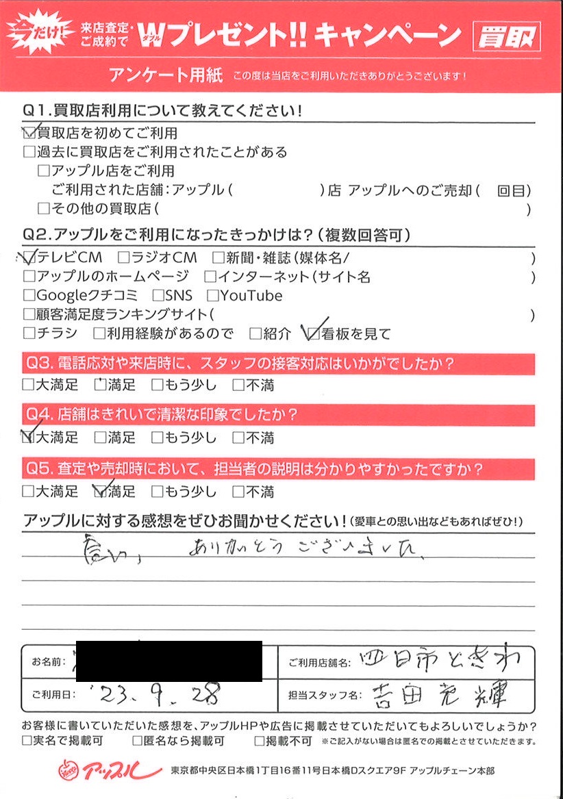 お車のご相談・ 査定だけでもOK! カンタン 入力 30秒 アップルがブランド買取始めました! お電話でも受付中! 受付時間10:00 ~ 18:30 0120-174-177 お車のご相談・ 査定だけでもOK! カンタン 入力 30秒 アップルがブランド買取始めました! お電話でも受付中! 受付時間10:00 ~ 18:30 0120-174-177 アップルがブランド買取始めました! お電話でも受付中! 受付時間10:00 ~ 18:30 0120-174-177 店舗情報 在庫車 スタッフ紹介 ブログ お客様の声 キャンペーン お得 無料査定 click お客様の声 ご記入日: 2023/09/28 M様 車名:トヨタ アクア 良い。 ありがとうございました。 前へ 次へ お客様の声一覧を見る