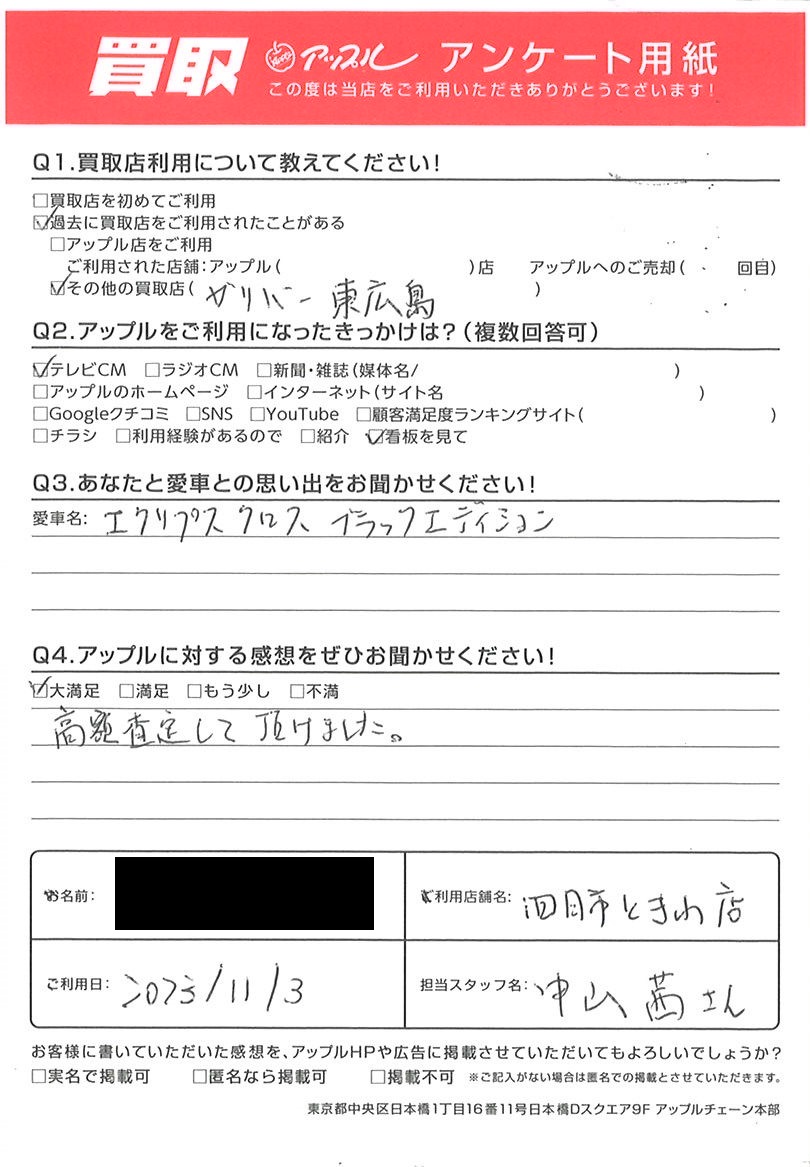 お車のご相談・ 査定だけでもOK! カンタン 入力 30秒 アップルがブランド買取始めました! お電話でも受付中! 受付時間10:00 ~ 18:30 0120-174-177 お車のご相談・ 査定だけでもOK! カンタン 入力 30秒 アップルがブランド買取始めました! お電話でも受付中! 受付時間10:00 ~ 18:30 0120-174-177 アップルがブランド買取始めました! お電話でも受付中! 受付時間10:00 ~ 18:30 0120-174-177 店舗情報 在庫車 スタッフ紹介 ブログ お客様の声 キャンペーン お得 無料査定 click お客様の声 ご記入日: 2023/11/03 M様 車名:三菱 エクリプスクロス 高額査定して頂けました。 前へ 次へ お客様の声一覧を見る
