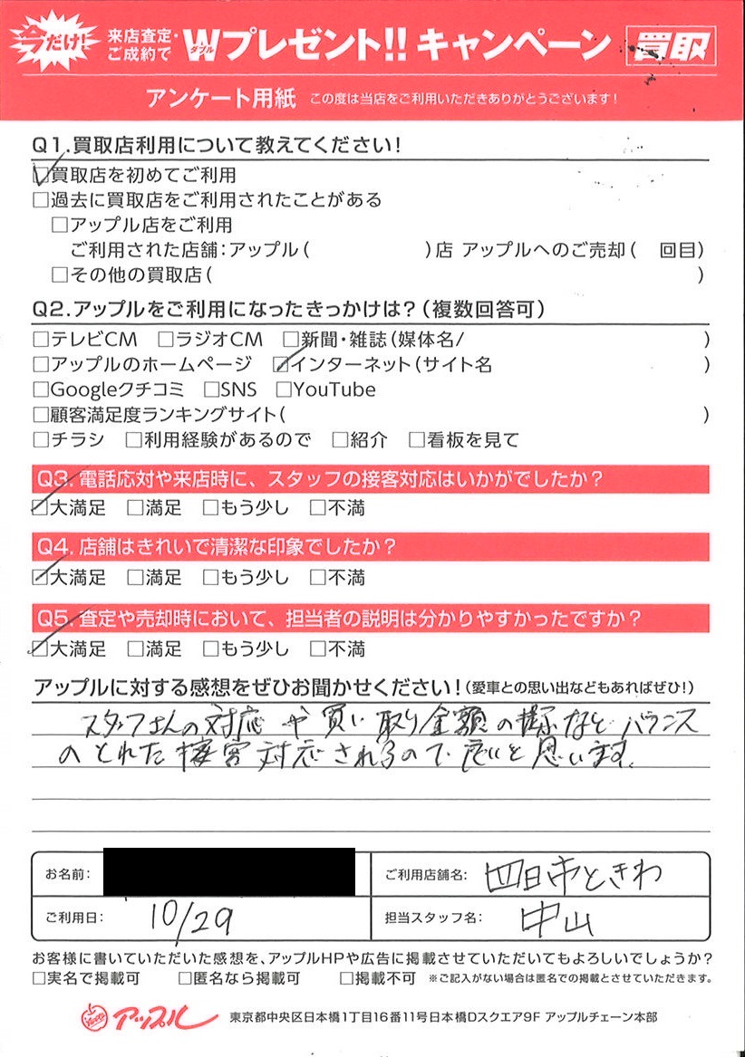 お車のご相談・ 査定だけでもOK! カンタン 入力 30秒 アップルがブランド買取始めました! お電話でも受付中! 受付時間10:00 ~ 18:30 0120-174-177 お車のご相談・ 査定だけでもOK! カンタン 入力 30秒 アップルがブランド買取始めました! お電話でも受付中! 受付時間10:00 ~ 18:30 0120-174-177 アップルがブランド買取始めました! お電話でも受付中! 受付時間10:00 ~ 18:30 0120-174-177 店舗情報 在庫車 スタッフ紹介 ブログ お客様の声 キャンペーン お得 無料査定 click お客様の声 ご記入日: 2023/10/29 M様 車名:ダイハツ ミラ スタッフさんの対応や買い取り金額の提示などバランスのとれた接客対応されるので良いと思います。 前へ 次へ お客様の声一覧を見る