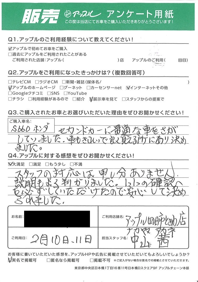 お車のご相談・ 査定だけでもOK! カンタン 入力 30秒 アップルがブランド買取始めました! お電話でも受付中! 受付時間10:00 ~ 18:30 0120-174-177 お車のご相談・ 査定だけでもOK! カンタン 入力 30秒 アップルがブランド買取始めました! お電話でも受付中! 受付時間10:00 ~ 18:30 0120-174-177 アップルがブランド買取始めました! お電話でも受付中! 受付時間10:00 ~ 18:30 0120-174-177 店舗情報 在庫車 スタッフ紹介 ブログ お客様の声 キャンペーン お得 無料査定 click お客様の声 ご記入日: 2024/02/10 S様 車名:ホンダ S660 スタッフの対応は申し分ありません。説明もよく判りました。1つ1つの確認へ必ずしていいただけたので安心して決められました。 前へ 次へ お客様の声一覧を見る