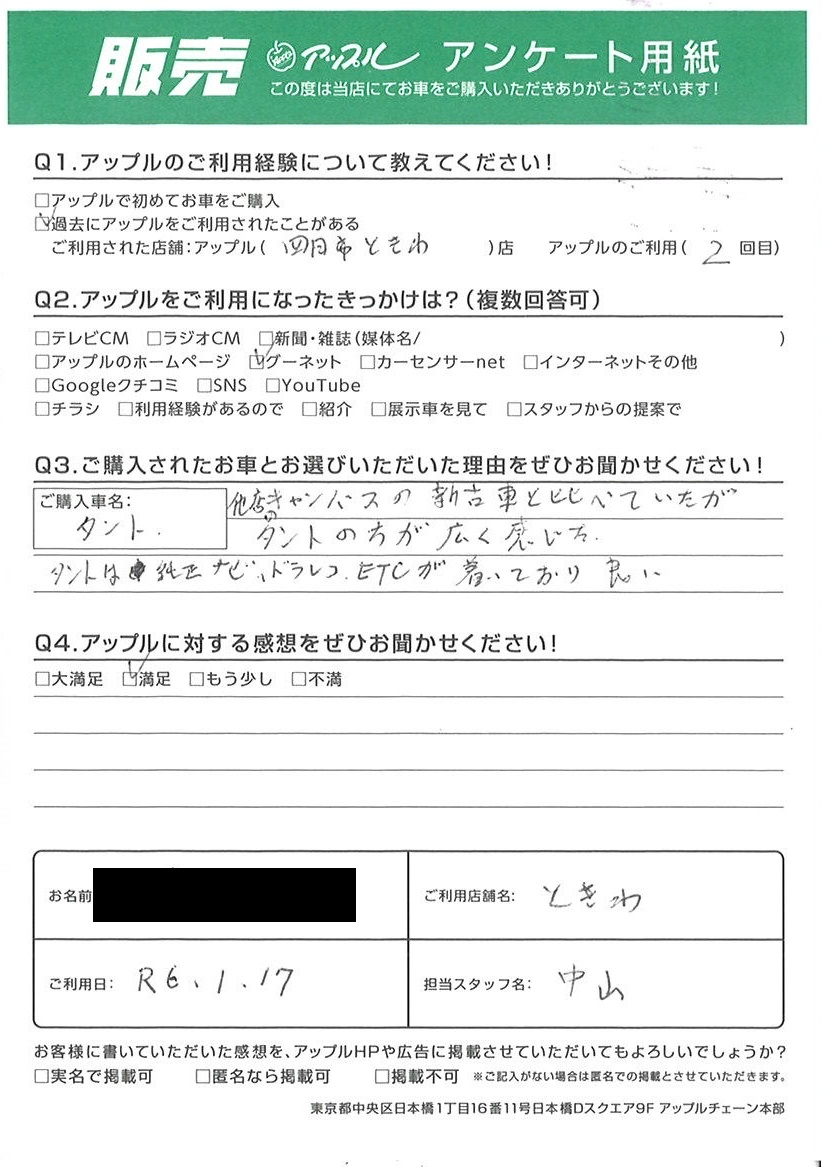 お車のご相談・ 査定だけでもOK! カンタン 入力 30秒 アップルがブランド買取始めました! お電話でも受付中! 受付時間10:00 ~ 18:30 0120-174-177 お車のご相談・ 査定だけでもOK! カンタン 入力 30秒 アップルがブランド買取始めました! お電話でも受付中! 受付時間10:00 ~ 18:30 0120-174-177 アップルがブランド買取始めました! お電話でも受付中! 受付時間10:00 ~ 18:30 0120-174-177 店舗情報 在庫車 スタッフ紹介 ブログ お客様の声 キャンペーン お得 無料査定 click お客様の声 ご記入日: 2024/01/17 G様 車名:ダイハツ タント 他店のキャンバスの新古車と比べていたがタントの方が広く感じた。タントは純正ナビ、ドラレコ、ETCが着いており良い。 前へ 次へ お客様の声一覧を見る