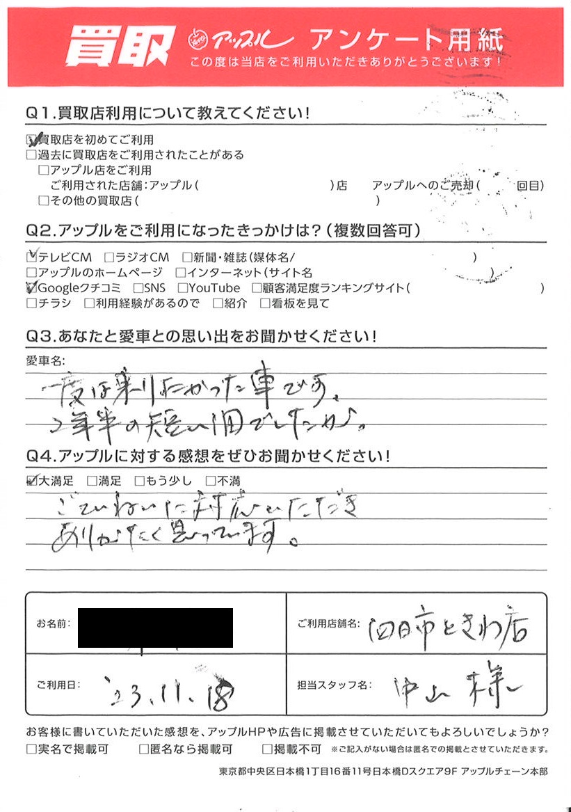 お車のご相談・ 査定だけでもOK! カンタン 入力 30秒 アップルがブランド買取始めました! お電話でも受付中! 受付時間10:00 ~ 18:30 0120-174-177 お車のご相談・ 査定だけでもOK! カンタン 入力 30秒 アップルがブランド買取始めました! お電話でも受付中! 受付時間10:00 ~ 18:30 0120-174-177 アップルがブランド買取始めました! お電話でも受付中! 受付時間10:00 ~ 18:30 0120-174-177 店舗情報 在庫車 スタッフ紹介 ブログ お客様の声 キャンペーン お得 無料査定 click お客様の声 ご記入日: 2023/11/18 K様 車名:トヨタ アルファード(H27年1月~のHYBRID含む) ごていねいに対応いただきありがたく思っています。 前へ 次へ お客様の声一覧を見る
