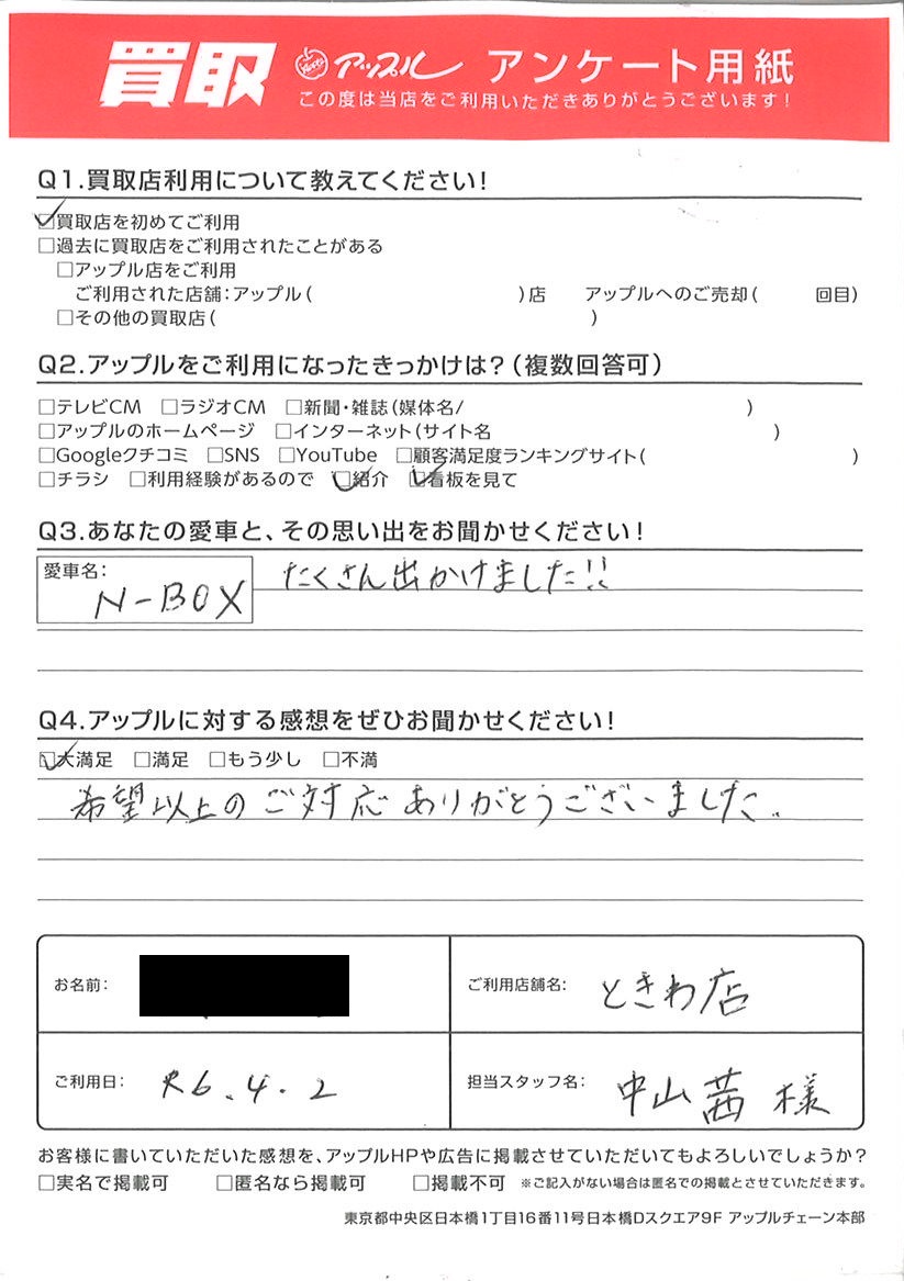 お車のご相談・ 査定だけでもOK! カンタン 入力 30秒 アップルがブランド買取始めました! お電話でも受付中! 受付時間10:00 ~ 18:30 0120-174-177 お車のご相談・ 査定だけでもOK! カンタン 入力 30秒 アップルがブランド買取始めました! お電話でも受付中! 受付時間10:00 ~ 18:30 0120-174-177 アップルがブランド買取始めました! お電話でも受付中! 受付時間10:00 ~ 18:30 0120-174-177 店舗情報 在庫車 スタッフ紹介 ブログ お客様の声 キャンペーン お得 無料査定 click お客様の声 ご記入日: 2024/04/02 O様 車名:ホンダ N-BOX 希望以上のご対応ありがとうございました。 前へ 次へ お客様の声一覧を見る