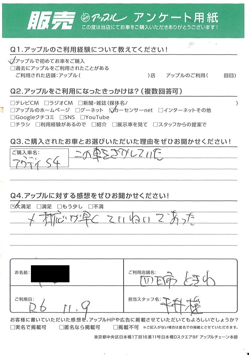 お車のご相談・ 査定だけでもOK! カンタン 入力 30秒 アップルがブランド買取始めました! お電話でも受付中! 受付時間10:00 ~ 18:30 0120-174-177 お車のご相談・ 査定だけでもOK! カンタン 入力 30秒 アップルがブランド買取始めました! お電話でも受付中! 受付時間10:00 ~ 18:30 0120-174-177 アップルがブランド買取始めました! お電話でも受付中! 受付時間10:00 ~ 18:30 0120-174-177 店舗情報 在庫車 スタッフ紹介 ブログ お客様の声 キャンペーン お得 無料査定 click お客様の声 ご記入日: 2024/11/09 T様 車名:アウディ S4 対応が早くてていねいであった 前へ 次へ お客様の声一覧を見る