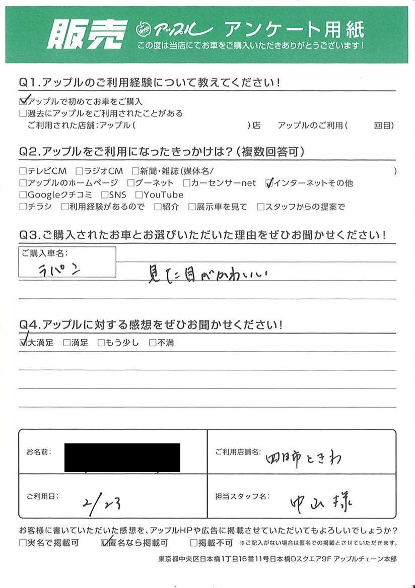 お車のご相談・ 査定だけでもOK! カンタン 入力 30秒 アップルがブランド買取始めました! お電話でも受付中! 受付時間10:00 ~ 18:30 0120-174-177 お車のご相談・ 査定だけでもOK! カンタン 入力 30秒 アップルがブランド買取始めました! お電話でも受付中! 受付時間10:00 ~ 18:30 0120-174-177 アップルがブランド買取始めました! お電話でも受付中! 受付時間10:00 ~ 18:30 0120-174-177 店舗情報 在庫車 スタッフ紹介 ブログ お客様の声 キャンペーン お得 無料査定 click お客様の声 ご記入日: 2025/02/23 H様 車名:スズキ アルトラパン ラパン(アルト) 見た目がかわいい 前へ 次へ お客様の声一覧を見る