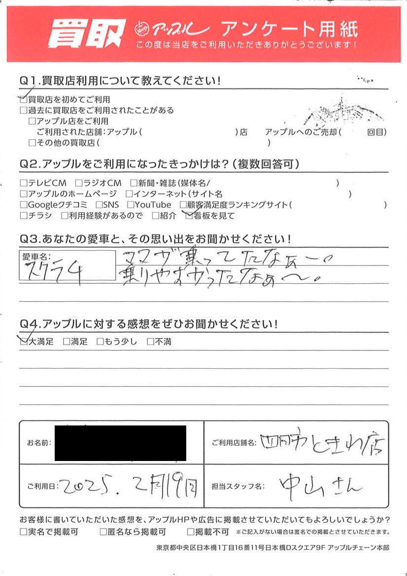 お車のご相談・ 査定だけでもOK! カンタン 入力 30秒 アップルがブランド買取始めました! お電話でも受付中! 受付時間10:00 ~ 18:30 0120-174-177 お車のご相談・ 査定だけでもOK! カンタン 入力 30秒 アップルがブランド買取始めました! お電話でも受付中! 受付時間10:00 ~ 18:30 0120-174-177 アップルがブランド買取始めました! お電話でも受付中! 受付時間10:00 ~ 18:30 0120-174-177 店舗情報 在庫車 スタッフ紹介 ブログ お客様の声 キャンペーン お得 無料査定 click お客様の声 ご記入日: 2025/02/19 S様 車名:マツダ スクラムバン ママが乗ってたなぁー。乗りやすかったなぁ~。 前へ 次へ お客様の声一覧を見る