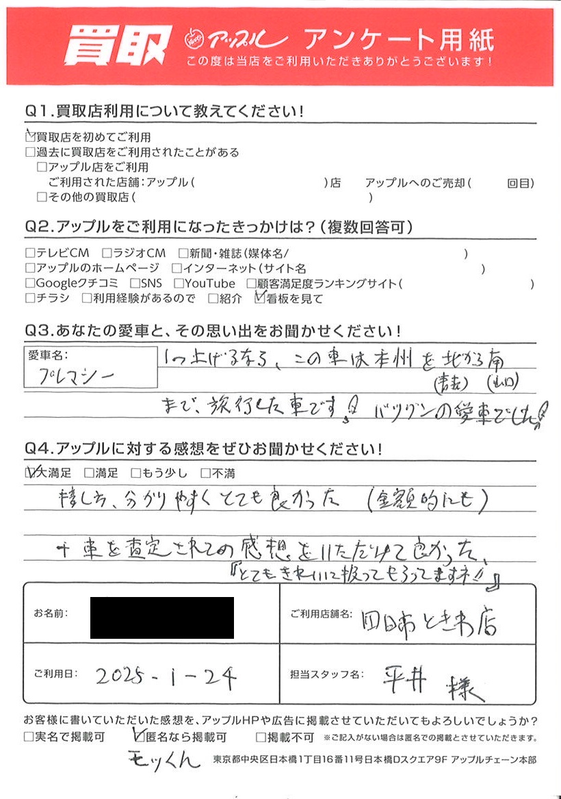 お車のご相談・ 査定だけでもOK! カンタン 入力 30秒 アップルがブランド買取始めました! お電話でも受付中! 受付時間10:00 ~ 18:30 0120-174-177 お車のご相談・ 査定だけでもOK! カンタン 入力 30秒 アップルがブランド買取始めました! お電話でも受付中! 受付時間10:00 ~ 18:30 0120-174-177 アップルがブランド買取始めました! お電話でも受付中! 受付時間10:00 ~ 18:30 0120-174-177 店舗情報 在庫車 スタッフ紹介 ブログ お客様の声 キャンペーン お得 無料査定 click お客様の声 ご記入日: 2025/01/24 M様 車名:マツダ プレマシー 接し方、分かりやすくとても良かった(金額的にも)+車を査定されての感想をいただけて良かった『とてもきれいに扱ってもらってますネ!』 前へ 次へ お客様の声一覧を見る