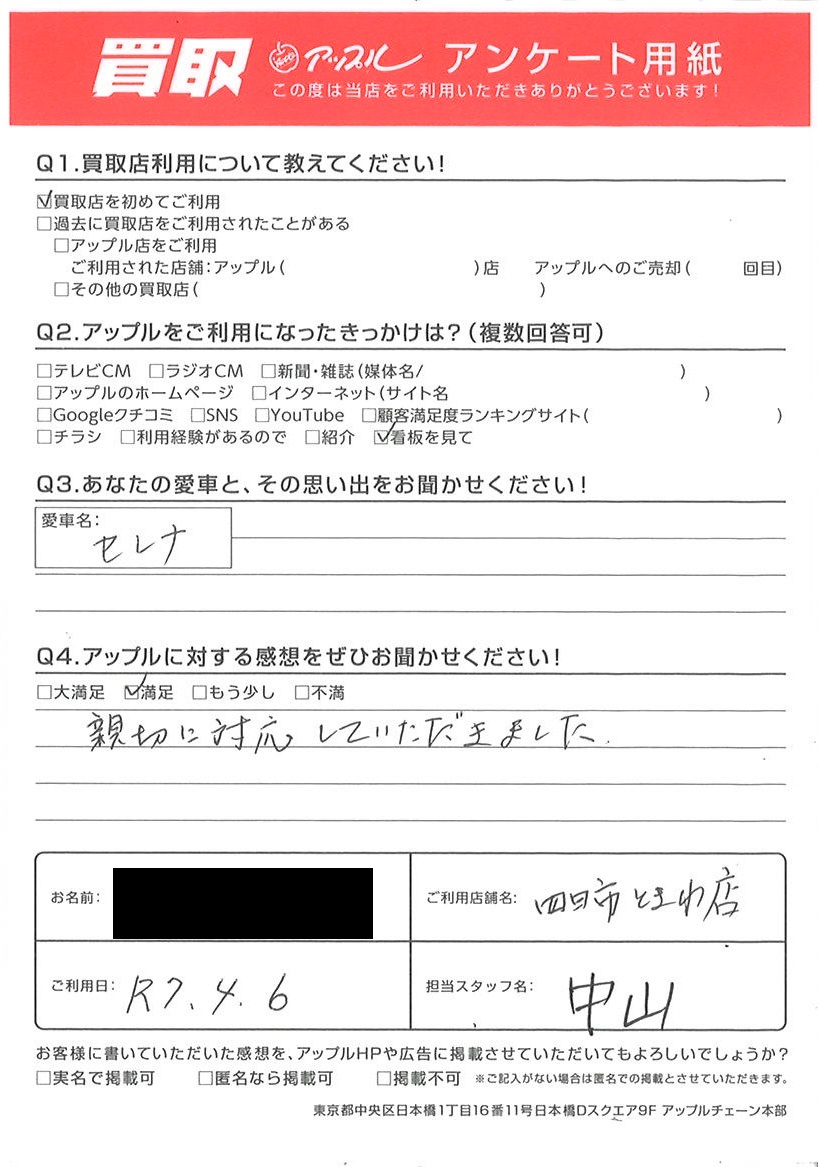 お車のご相談・ 査定だけでもOK! カンタン 入力 30秒 アップルがブランド買取始めました! お電話でも受付中! 受付時間10:00 ~ 18:30 0120-174-177 お車のご相談・ 査定だけでもOK! カンタン 入力 30秒 アップルがブランド買取始めました! お電話でも受付中! 受付時間10:00 ~ 18:30 0120-174-177 アップルがブランド買取始めました! お電話でも受付中! 受付時間10:00 ~ 18:30 0120-174-177 店舗情報 在庫車 スタッフ紹介 ブログ お客様の声 キャンペーン お得 無料査定 click お客様の声 ご記入日: 2025/04/06 S様 車名:日産 セレナ 親切に対応していただきました 前へ 次へ お客様の声一覧を見る