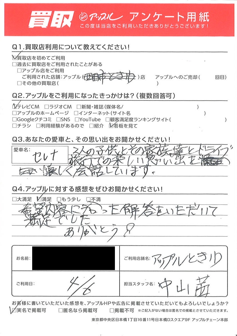 お車のご相談・ 査定だけでもOK! カンタン 入力 30秒 アップルがブランド買取始めました! お電話でも受付中! 受付時間10:00 ~ 18:30 0120-174-177 お車のご相談・ 査定だけでもOK! カンタン 入力 30秒 アップルがブランド買取始めました! お電話でも受付中! 受付時間10:00 ~ 18:30 0120-174-177 アップルがブランド買取始めました! お電話でも受付中! 受付時間10:00 ~ 18:30 0120-174-177 店舗情報 在庫車 スタッフ紹介 ブログ お客様の声 キャンペーン お得 無料査定 click お客様の声 ご記入日: 2025/04/06 S様 車名:日産 セレナ 希望無いように沿った解答をいただいて満足でした ありがとう! 前へ 次へ お客様の声一覧を見る