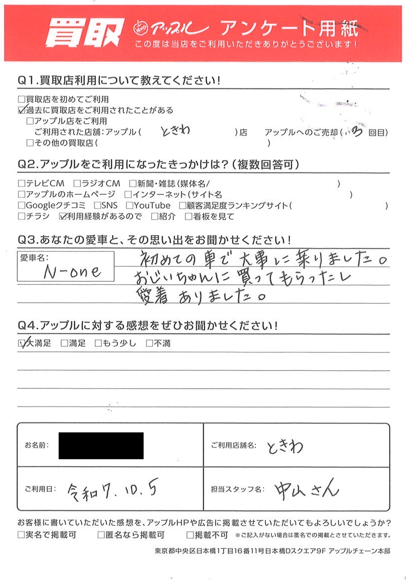 お車のご相談・ 査定だけでもOK! カンタン 入力 30秒 アップルがブランド買取始めました! お電話でも受付中! 受付時間10:00 ~ 18:30 0120-174-177 お車のご相談・ 査定だけでもOK! カンタン 入力 30秒 アップルがブランド買取始めました! お電話でも受付中! 受付時間10:00 ~ 18:30 0120-174-177 アップルがブランド買取始めました! お電話でも受付中! 受付時間10:00 ~ 18:30 0120-174-177 店舗情報 在庫車 スタッフ紹介 ブログ お客様の声 キャンペーン お得 無料査定 click お客様の声 ご記入日: 2025/10/05 M様 車名:ホンダ N-ONE 初めての車で大事に乗りました。おじいちゃんに買ってもらったし愛着ありました。 前へ 次へ お客様の声一覧を見る