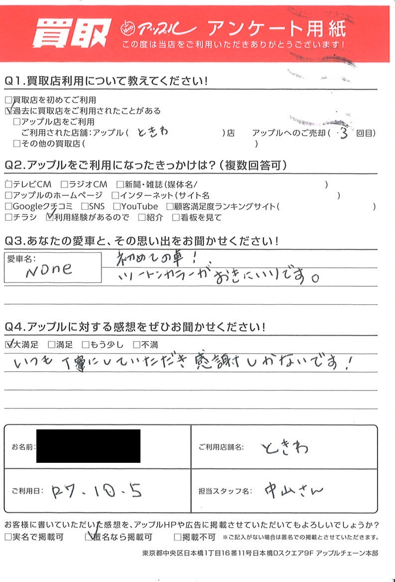 お車のご相談・ 査定だけでもOK! カンタン 入力 30秒 アップルがブランド買取始めました! お電話でも受付中! 受付時間10:00 ~ 18:30 0120-174-177 お車のご相談・ 査定だけでもOK! カンタン 入力 30秒 アップルがブランド買取始めました! お電話でも受付中! 受付時間10:00 ~ 18:30 0120-174-177 アップルがブランド買取始めました! お電話でも受付中! 受付時間10:00 ~ 18:30 0120-174-177 店舗情報 在庫車 スタッフ紹介 ブログ お客様の声 キャンペーン お得 無料査定 click お客様の声 ご記入日: 2025/10/05 A様 車名:ホンダ N-ONE いつも丁寧にしていただき感謝しかないです! 前へ 次へ お客様の声一覧を見る