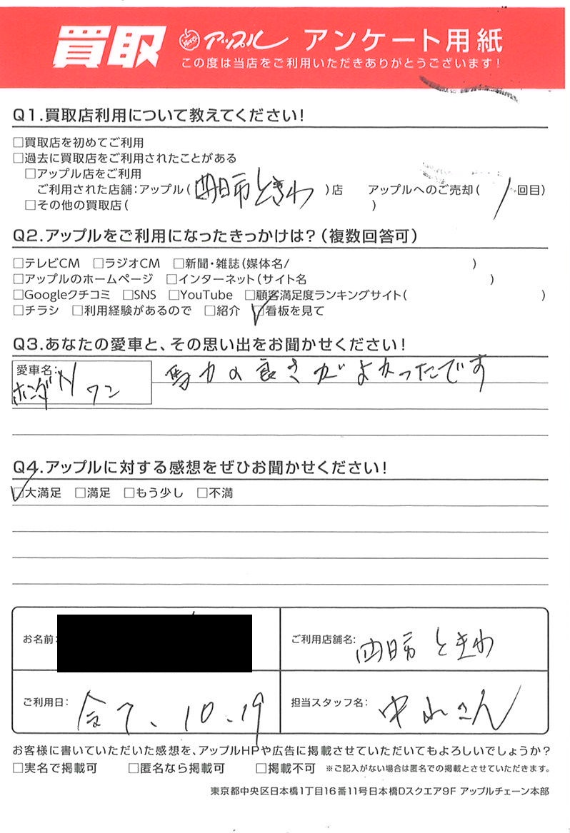お車のご相談・ 査定だけでもOK! カンタン 入力 30秒 アップルがブランド買取始めました! お電話でも受付中! 受付時間10:00 ~ 18:30 0120-174-177 お車のご相談・ 査定だけでもOK! カンタン 入力 30秒 アップルがブランド買取始めました! お電話でも受付中! 受付時間10:00 ~ 18:30 0120-174-177 アップルがブランド買取始めました! お電話でも受付中! 受付時間10:00 ~ 18:30 0120-174-177 店舗情報 在庫車 スタッフ紹介 ブログ お客様の声 キャンペーン お得 無料査定 click お客様の声 ご記入日: 2025/10/19 K様 車名:ホンダ N-ONE 馬力の良さがよかったです 前へ 次へ お客様の声一覧を見る