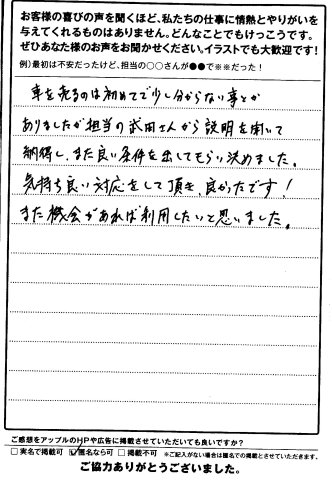 お車のご相談・ 査定だけでもOK! カンタン 入力 30秒 アップルがブランド買取始めました! お電話でも受付中! 受付時間10:00 ~ 18:30 0120-174-177 お車のご相談・ 査定だけでもOK! カンタン 入力 30秒 アップルがブランド買取始めました! お電話でも受付中! 受付時間10:00 ~ 18:30 0120-174-177 アップルがブランド買取始めました! お電話でも受付中! 受付時間10:00 ~ 18:30 0120-174-177 店舗情報 在庫車 スタッフ紹介 ブログ お客様の声 キャンペーン お得 無料査定 click お客様の声 ご記入日: 2011/05/21 四日市市K・Y様 車を売るのは初めてで少し分からない事とかありましたが、担当の武田さんから説明を聞いて納得し、また良い条件を出してもらい決めました。気持ち良い対応をして頂き、良かったです!また機会があれば利用したいと思いました。 前へ 次へ お客様の声一覧を見る