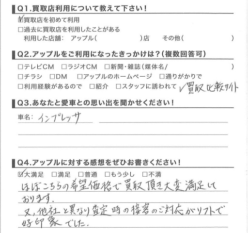 お車のご相談・ 査定だけでもOK! カンタン 入力 30秒 アップルがブランド買取始めました! お電話でも受付中! 受付時間10:00 ~ 18:30 0120-174-177 お車のご相談・ 査定だけでもOK! カンタン 入力 30秒 アップルがブランド買取始めました! お電話でも受付中! 受付時間10:00 ~ 18:30 0120-174-177 アップルがブランド買取始めました! お電話でも受付中! 受付時間10:00 ~ 18:30 0120-174-177 店舗情報 在庫車 スタッフ紹介 ブログ お客様の声 キャンペーン お得 無料査定 click お客様の声 ご記入日: 2015/02/08 W様 ほぼこちらの希望価格で買取頂き大変満足しております。又、他社と異なり査定時の接客のご対応がソフトで好印象でした。担当:松井 前へ 次へ お客様の声一覧を見る