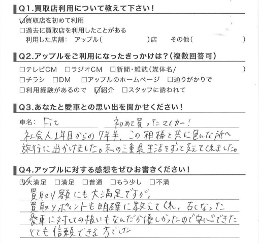 お車のご相談・ 査定だけでもOK! カンタン 入力 30秒 アップルがブランド買取始めました! お電話でも受付中! 受付時間10:00 ~ 18:30 0120-174-177 お車のご相談・ 査定だけでもOK! カンタン 入力 30秒 アップルがブランド買取始めました! お電話でも受付中! 受付時間10:00 ~ 18:30 0120-174-177 アップルがブランド買取始めました! お電話でも受付中! 受付時間10:00 ~ 18:30 0120-174-177 店舗情報 在庫車 スタッフ紹介 ブログ お客様の声 キャンペーン お得 無料査定 click お客様の声 ご記入日: 2015/02/22 M様 買取額にも大変満足ですが、買取りポイントも明確に教えてくれ、古くなった愛車に対しての扱いもなんだか優しかったので安心できた。とても信頼できる方でした。 前へ 次へ お客様の声一覧を見る