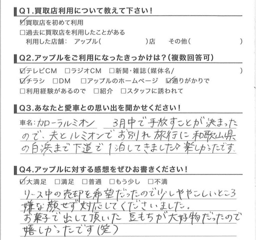 お車のご相談・ 査定だけでもOK! カンタン 入力 30秒 アップルがブランド買取始めました! お電話でも受付中! 受付時間10:00 ~ 18:30 0120-174-177 お車のご相談・ 査定だけでもOK! カンタン 入力 30秒 アップルがブランド買取始めました! お電話でも受付中! 受付時間10:00 ~ 18:30 0120-174-177 アップルがブランド買取始めました! お電話でも受付中! 受付時間10:00 ~ 18:30 0120-174-177 店舗情報 在庫車 スタッフ紹介 ブログ お客様の声 キャンペーン お得 無料査定 click お客様の声 ご記入日: 2015/03/14 Y様 リース中の売却を希望だったので少しややこしいところ嫌な顔せず対応してくださいました。お菓子で出して頂いた豆もちが大好物だったので嬉しかったです(笑)担当:鈴木 前へ 次へ お客様の声一覧を見る
