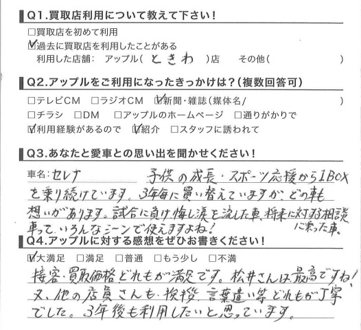 お車のご相談・ 査定だけでもOK! カンタン 入力 30秒 アップルがブランド買取始めました! お電話でも受付中! 受付時間10:00 ~ 18:30 0120-174-177 お車のご相談・ 査定だけでもOK! カンタン 入力 30秒 アップルがブランド買取始めました! お電話でも受付中! 受付時間10:00 ~ 18:30 0120-174-177 アップルがブランド買取始めました! お電話でも受付中! 受付時間10:00 ~ 18:30 0120-174-177 店舗情報 在庫車 スタッフ紹介 ブログ お客様の声 キャンペーン お得 無料査定 click お客様の声 ご記入日: 2015/11/22 K様 接客、買取価格、どれもが満足です。松井さんは最高ですね!又、他の店員さんも、挨拶、言葉遣い等どれもが丁寧でした。3年後も利用したいと思っています。担当:松井 前へ 次へ お客様の声一覧を見る