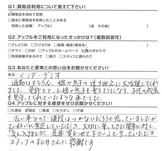 お車のご相談・ 査定だけでもOK! カンタン 入力 30秒 アップルがブランド買取始めました! お電話でも受付中! 受付時間10:00 ~ 18:30 0120-174-177 お車のご相談・ 査定だけでもOK! カンタン 入力 30秒 アップルがブランド買取始めました! お電話でも受付中! 受付時間10:00 ~ 18:30 0120-174-177 アップルがブランド買取始めました! お電話でも受付中! 受付時間10:00 ~ 18:30 0120-174-177 店舗情報 在庫車 スタッフ紹介 ブログ お客様の声 キャンペーン お得 無料査定 click お客様の声 ご記入日: 2016/03/13 Y様 古い車なので値段はつかないだろうと思っていましたが、ていねいに査定していただき、大切に乗ってきた愛車に対し、「気に入りました 是非買わせて下さい」と言っていただき、スタッフの松井さんに感謝です。担当:松井 前へ 次へ お客様の声一覧を見る