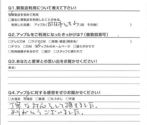お車のご相談・ 査定だけでもOK! カンタン 入力 30秒 アップルがブランド買取始めました! お電話でも受付中! 受付時間10:00 ~ 18:30 0120-174-177 お車のご相談・ 査定だけでもOK! カンタン 入力 30秒 アップルがブランド買取始めました! お電話でも受付中! 受付時間10:00 ~ 18:30 0120-174-177 アップルがブランド買取始めました! お電話でも受付中! 受付時間10:00 ~ 18:30 0120-174-177 店舗情報 在庫車 スタッフ紹介 ブログ お客様の声 キャンペーン お得 無料査定 click お客様の声 ご記入日: 2016/03/19 I様 丁寧な対応をして頂きました。ありがとうございました。担当:松井 前へ 次へ お客様の声一覧を見る