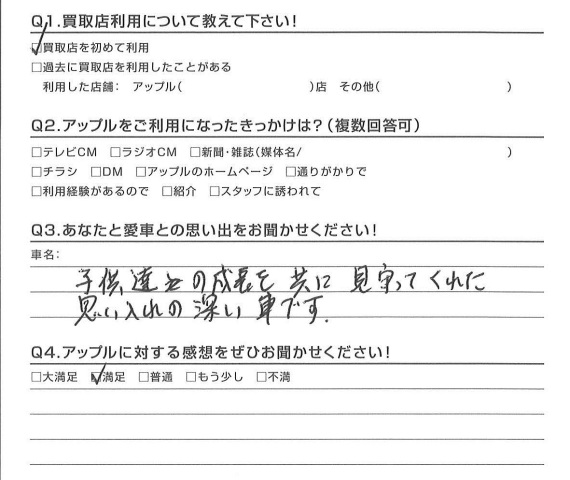 お車のご相談・ 査定だけでもOK! カンタン 入力 30秒 アップルがブランド買取始めました! お電話でも受付中! 受付時間10:00 ~ 18:30 0120-174-177 お車のご相談・ 査定だけでもOK! カンタン 入力 30秒 アップルがブランド買取始めました! お電話でも受付中! 受付時間10:00 ~ 18:30 0120-174-177 アップルがブランド買取始めました! お電話でも受付中! 受付時間10:00 ~ 18:30 0120-174-177 店舗情報 在庫車 スタッフ紹介 ブログ お客様の声 キャンペーン お得 無料査定 click お客様の声 ご記入日: 2016/03/19 I様 Q.あなたと愛車との思い出をお聞かせください!A.子供達の成長を共に見守ってくれた思い入れの深い車です。担当:鈴木 前へ 次へ お客様の声一覧を見る