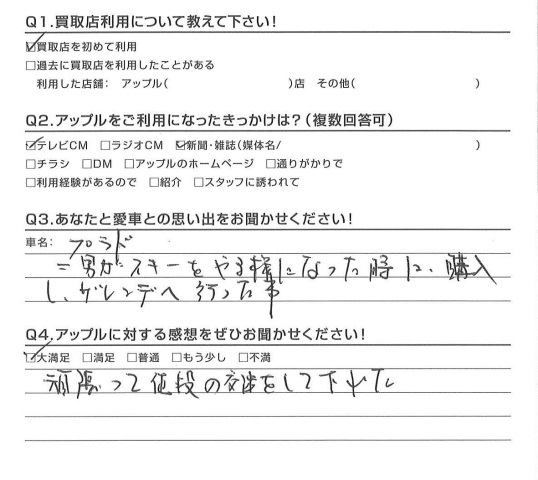 お車のご相談・ 査定だけでもOK! カンタン 入力 30秒 アップルがブランド買取始めました! お電話でも受付中! 受付時間10:00 ~ 18:30 0120-174-177 お車のご相談・ 査定だけでもOK! カンタン 入力 30秒 アップルがブランド買取始めました! お電話でも受付中! 受付時間10:00 ~ 18:30 0120-174-177 アップルがブランド買取始めました! お電話でも受付中! 受付時間10:00 ~ 18:30 0120-174-177 店舗情報 在庫車 スタッフ紹介 ブログ お客様の声 キャンペーン お得 無料査定 click お客様の声 ご記入日: 2016/02/20 匿名希望様 頑張って値段の交渉をして下れた担当:松嶋 前へ 次へ お客様の声一覧を見る