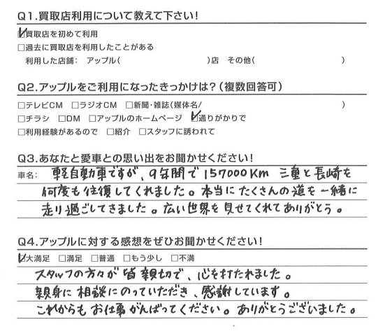 お車のご相談・ 査定だけでもOK! カンタン 入力 30秒 アップルがブランド買取始めました! お電話でも受付中! 受付時間10:00 ~ 18:30 0120-174-177 お車のご相談・ 査定だけでもOK! カンタン 入力 30秒 アップルがブランド買取始めました! お電話でも受付中! 受付時間10:00 ~ 18:30 0120-174-177 アップルがブランド買取始めました! お電話でも受付中! 受付時間10:00 ~ 18:30 0120-174-177 店舗情報 在庫車 スタッフ紹介 ブログ お客様の声 キャンペーン お得 無料査定 click お客様の声 ご記入日: 2016/03/27 I様 スタッフの方々が皆親切で、心を打たれました。親身に相談にのっていただき、感謝しています。これからもお仕事がんばってください。ありがとうございました。担当:松井 前へ 次へ お客様の声一覧を見る