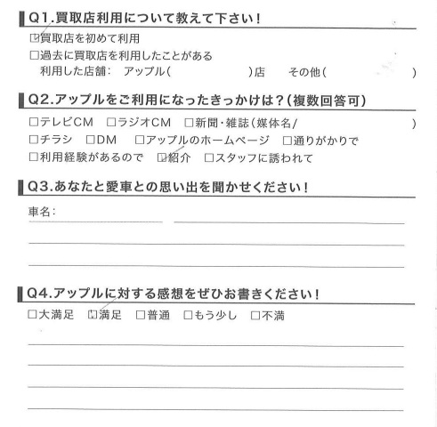 お車のご相談・ 査定だけでもOK! カンタン 入力 30秒 アップルがブランド買取始めました! お電話でも受付中! 受付時間10:00 ~ 18:30 0120-174-177 お車のご相談・ 査定だけでもOK! カンタン 入力 30秒 アップルがブランド買取始めました! お電話でも受付中! 受付時間10:00 ~ 18:30 0120-174-177 アップルがブランド買取始めました! お電話でも受付中! 受付時間10:00 ~ 18:30 0120-174-177 店舗情報 在庫車 スタッフ紹介 ブログ お客様の声 キャンペーン お得 無料査定 click お客様の声 ご記入日: 2015/02/03 I様 担当:西脇 前へ 次へ お客様の声一覧を見る