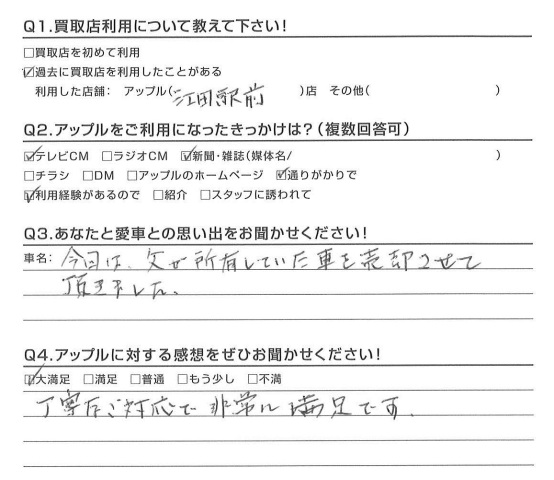 お車のご相談・ 査定だけでもOK! カンタン 入力 30秒 アップルがブランド買取始めました! お電話でも受付中! 受付時間10:00 ~ 18:30 0120-174-177 お車のご相談・ 査定だけでもOK! カンタン 入力 30秒 アップルがブランド買取始めました! お電話でも受付中! 受付時間10:00 ~ 18:30 0120-174-177 アップルがブランド買取始めました! お電話でも受付中! 受付時間10:00 ~ 18:30 0120-174-177 店舗情報 在庫車 スタッフ紹介 ブログ お客様の声 キャンペーン お得 無料査定 click お客様の声 ご記入日: 2016/01/10 H様 丁寧なご対応で非常に満足です。担当:野口 前へ 次へ お客様の声一覧を見る