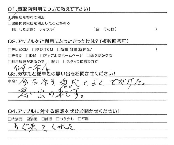 お車のご相談・ 査定だけでもOK! カンタン 入力 30秒 アップルがブランド買取始めました! お電話でも受付中! 受付時間10:00 ~ 18:30 0120-174-177 お車のご相談・ 査定だけでもOK! カンタン 入力 30秒 アップルがブランド買取始めました! お電話でも受付中! 受付時間10:00 ~ 18:30 0120-174-177 アップルがブランド買取始めました! お電話でも受付中! 受付時間10:00 ~ 18:30 0120-174-177 店舗情報 在庫車 スタッフ紹介 ブログ お客様の声 キャンペーン お得 無料査定 click お客様の声 ご記入日: 2016/01/10 M様 すぐ来てくれた。担当:松嶋 前へ 次へ お客様の声一覧を見る
