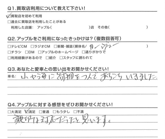 お車のご相談・ 査定だけでもOK! カンタン 入力 30秒 アップルがブランド買取始めました! お電話でも受付中! 受付時間10:00 ~ 18:30 0120-174-177 お車のご相談・ 査定だけでもOK! カンタン 入力 30秒 アップルがブランド買取始めました! お電話でも受付中! 受付時間10:00 ~ 18:30 0120-174-177 アップルがブランド買取始めました! お電話でも受付中! 受付時間10:00 ~ 18:30 0120-174-177 店舗情報 在庫車 スタッフ紹介 ブログ お客様の声 キャンペーン お得 無料査定 click お客様の声 ご記入日: 2016/01/25 I様 親切な対応だったと思います。担当:黒澤 前へ 次へ お客様の声一覧を見る