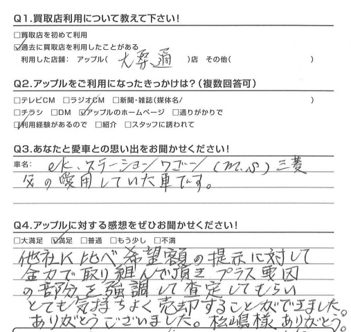 お車のご相談・ 査定だけでもOK! カンタン 入力 30秒 アップルがブランド買取始めました! お電話でも受付中! 受付時間10:00 ~ 18:30 0120-174-177 お車のご相談・ 査定だけでもOK! カンタン 入力 30秒 アップルがブランド買取始めました! お電話でも受付中! 受付時間10:00 ~ 18:30 0120-174-177 アップルがブランド買取始めました! お電話でも受付中! 受付時間10:00 ~ 18:30 0120-174-177 店舗情報 在庫車 スタッフ紹介 ブログ お客様の声 キャンペーン お得 無料査定 click お客様の声 ご記入日: 2016/03/20 匿名希望様 他社に比べ希望額の提示に対して全力で取り組んで頂きプラス要因の部分を強調して査定してもらいとても気持ちよく売却することができました。ありがとうございました。松嶋様ありがとう。担当:松嶋 前へ 次へ お客様の声一覧を見る
