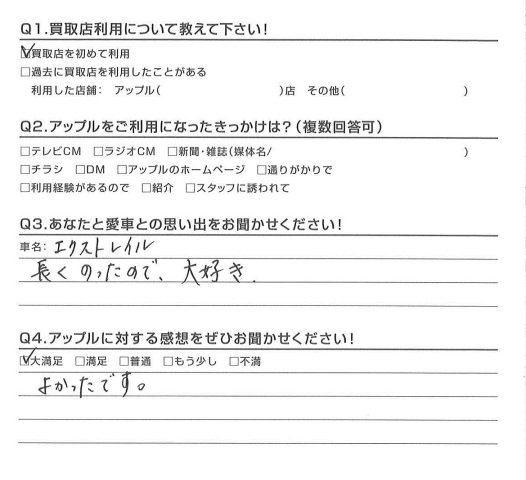 お車のご相談・ 査定だけでもOK! カンタン 入力 30秒 アップルがブランド買取始めました! お電話でも受付中! 受付時間10:00 ~ 18:30 0120-174-177 お車のご相談・ 査定だけでもOK! カンタン 入力 30秒 アップルがブランド買取始めました! お電話でも受付中! 受付時間10:00 ~ 18:30 0120-174-177 アップルがブランド買取始めました! お電話でも受付中! 受付時間10:00 ~ 18:30 0120-174-177 店舗情報 在庫車 スタッフ紹介 ブログ お客様の声 キャンペーン お得 無料査定 click お客様の声 ご記入日: 2016/04/21 T様 よかったです。担当:松嶋 前へ 次へ お客様の声一覧を見る