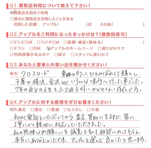 お車のご相談・ 査定だけでもOK! カンタン 入力 30秒 アップルがブランド買取始めました! お電話でも受付中! 受付時間10:00 ~ 18:30 0120-174-177 お車のご相談・ 査定だけでもOK! カンタン 入力 30秒 アップルがブランド買取始めました! お電話でも受付中! 受付時間10:00 ~ 18:30 0120-174-177 アップルがブランド買取始めました! お電話でも受付中! 受付時間10:00 ~ 18:30 0120-174-177 店舗情報 在庫車 スタッフ紹介 ブログ お客様の声 キャンペーン お得 無料査定 click お客様の声 ご記入日: 2014/11/25 W様 初めて電話をいただいてから、査定、買取に至るまで、常に丁寧にかつ親切に対応していただきました。私の無理なお願いにも誠意をもって相談にのってもらえ本当にありがたかったです。アップルを選んで良かったと思います。担当:西脇 前へ 次へ お客様の声一覧を見る