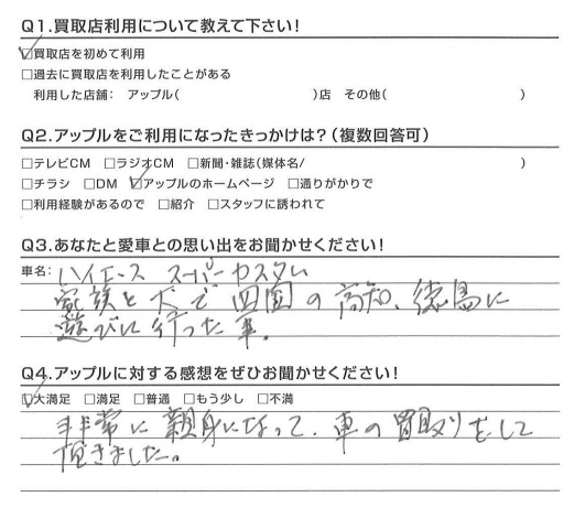 お車のご相談・ 査定だけでもOK! カンタン 入力 30秒 アップルがブランド買取始めました! お電話でも受付中! 受付時間10:00 ~ 18:30 0120-174-177 お車のご相談・ 査定だけでもOK! カンタン 入力 30秒 アップルがブランド買取始めました! お電話でも受付中! 受付時間10:00 ~ 18:30 0120-174-177 アップルがブランド買取始めました! お電話でも受付中! 受付時間10:00 ~ 18:30 0120-174-177 店舗情報 在庫車 スタッフ紹介 ブログ お客様の声 キャンペーン お得 無料査定 click お客様の声 ご記入日: 2016/01/11 M様 非常に親身になって、車の買取りをして頂きました。担当:松井 前へ 次へ お客様の声一覧を見る