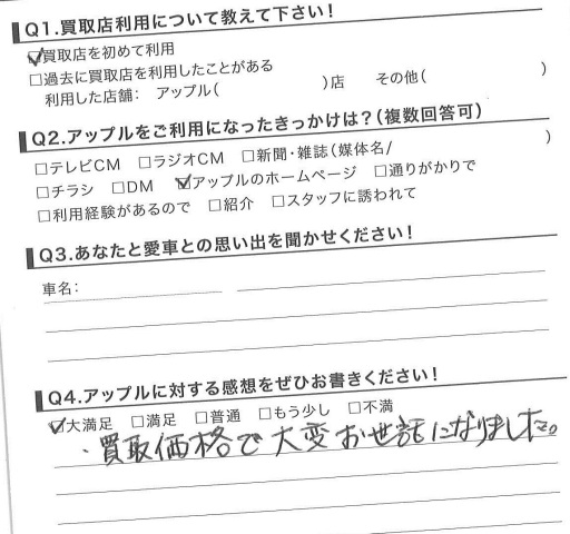 お車のご相談・ 査定だけでもOK! カンタン 入力 30秒 アップルがブランド買取始めました! お電話でも受付中! 受付時間10:00 ~ 18:30 0120-174-177 お車のご相談・ 査定だけでもOK! カンタン 入力 30秒 アップルがブランド買取始めました! お電話でも受付中! 受付時間10:00 ~ 18:30 0120-174-177 アップルがブランド買取始めました! お電話でも受付中! 受付時間10:00 ~ 18:30 0120-174-177 店舗情報 在庫車 スタッフ紹介 ブログ お客様の声 キャンペーン お得 無料査定 click お客様の声 ご記入日: 2015/02/13 S様 買取価格で大変お世話になりました。担当:西脇 前へ 次へ お客様の声一覧を見る