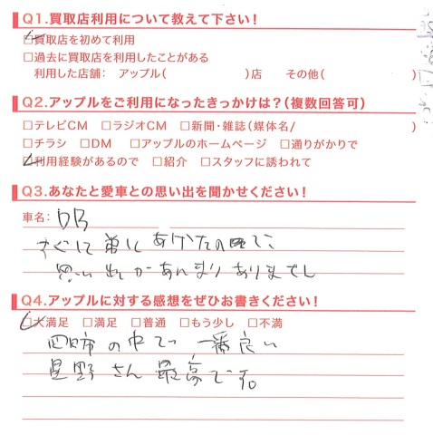 お車のご相談・ 査定だけでもOK! カンタン 入力 30秒 アップルがブランド買取始めました! お電話でも受付中! 受付時間10:00 ~ 18:30 0120-174-177 お車のご相談・ 査定だけでもOK! カンタン 入力 30秒 アップルがブランド買取始めました! お電話でも受付中! 受付時間10:00 ~ 18:30 0120-174-177 アップルがブランド買取始めました! お電話でも受付中! 受付時間10:00 ~ 18:30 0120-174-177 店舗情報 在庫車 スタッフ紹介 ブログ お客様の声 キャンペーン お得 無料査定 click お客様の声 ご記入日: 2014/10/11 N様 四日市の中で一番良い。星野さん最高です。担当:星野 前へ 次へ お客様の声一覧を見る