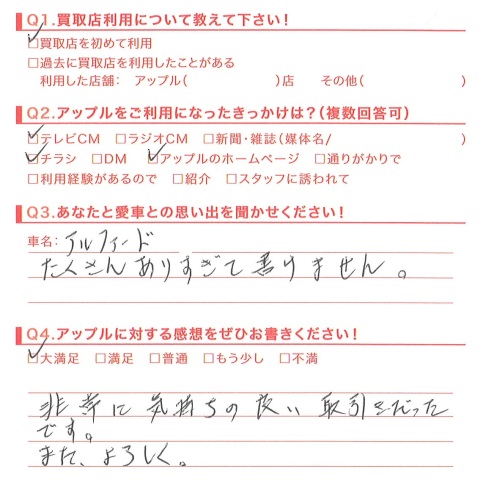 お車のご相談・ 査定だけでもOK! カンタン 入力 30秒 アップルがブランド買取始めました! お電話でも受付中! 受付時間10:00 ~ 18:30 0120-174-177 お車のご相談・ 査定だけでもOK! カンタン 入力 30秒 アップルがブランド買取始めました! お電話でも受付中! 受付時間10:00 ~ 18:30 0120-174-177 アップルがブランド買取始めました! お電話でも受付中! 受付時間10:00 ~ 18:30 0120-174-177 店舗情報 在庫車 スタッフ紹介 ブログ お客様の声 キャンペーン お得 無料査定 click お客様の声 ご記入日: 2014/10/28 H様 非常に気持ちの良い取引だったです。また、よろしく。担当:西脇 前へ 次へ お客様の声一覧を見る
