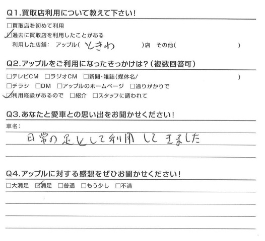 お車のご相談・ 査定だけでもOK! カンタン 入力 30秒 アップルがブランド買取始めました! お電話でも受付中! 受付時間10:00 ~ 18:30 0120-174-177 お車のご相談・ 査定だけでもOK! カンタン 入力 30秒 アップルがブランド買取始めました! お電話でも受付中! 受付時間10:00 ~ 18:30 0120-174-177 アップルがブランド買取始めました! お電話でも受付中! 受付時間10:00 ~ 18:30 0120-174-177 店舗情報 在庫車 スタッフ紹介 ブログ お客様の声 キャンペーン お得 無料査定 click お客様の声 ご記入日: 2016/06/05 Y様 日常の足として利用してきました。担当:鈴木 前へ 次へ お客様の声一覧を見る